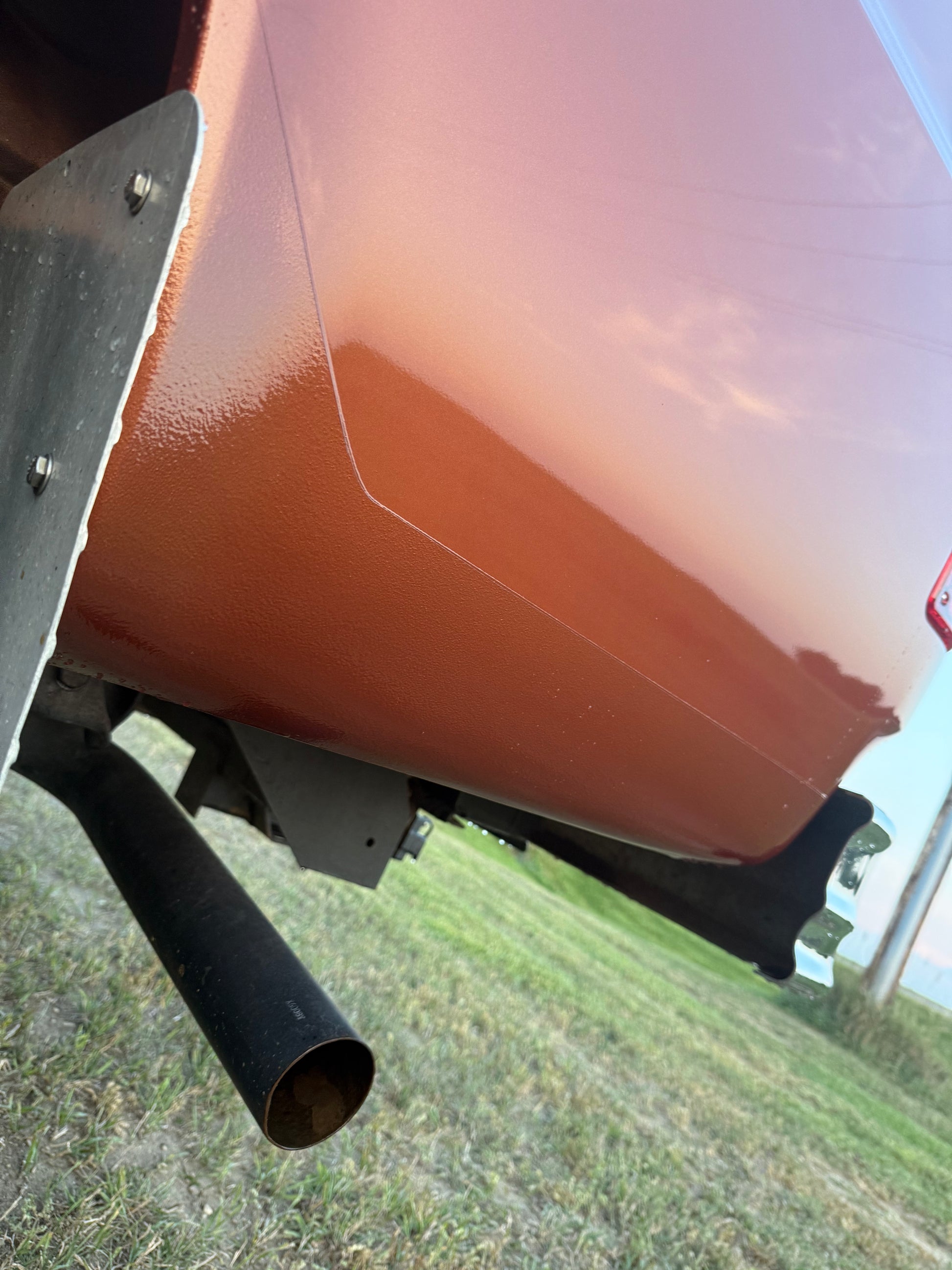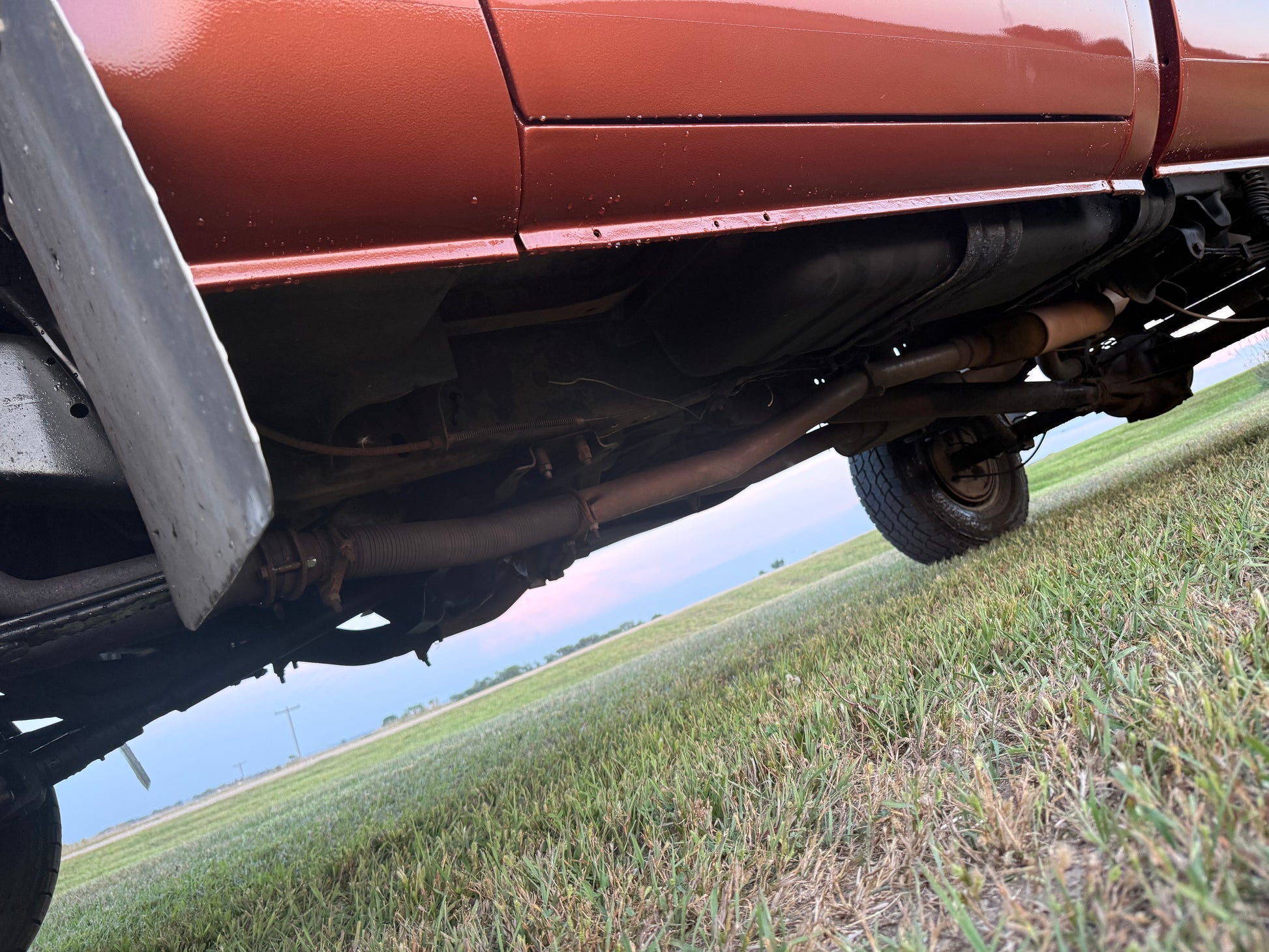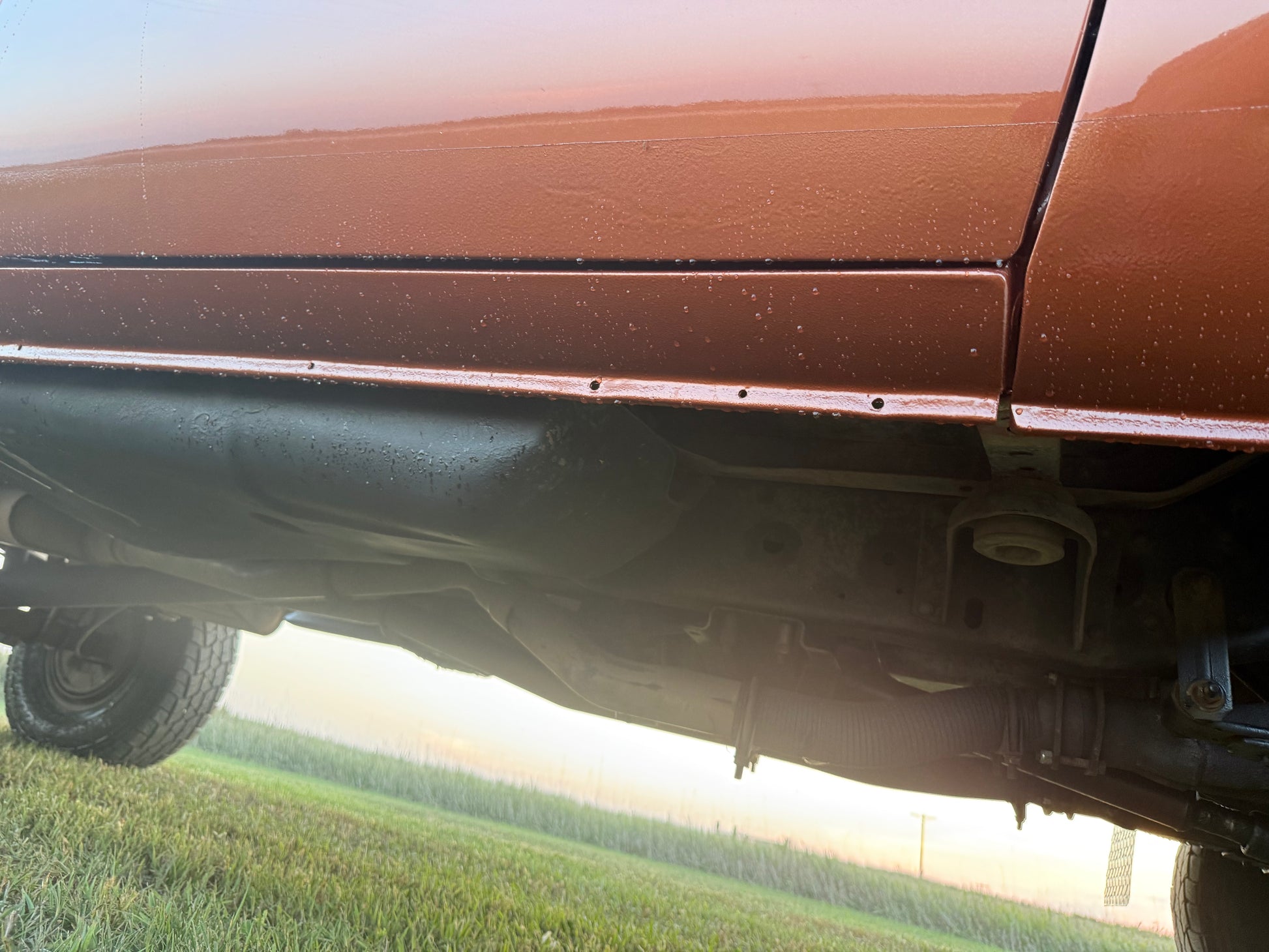 Small chip in top center of tailgate. Happened when truck got repainted in 2018. Rear half and front half of frame are repainted. Middle of frame under cab was left alone.